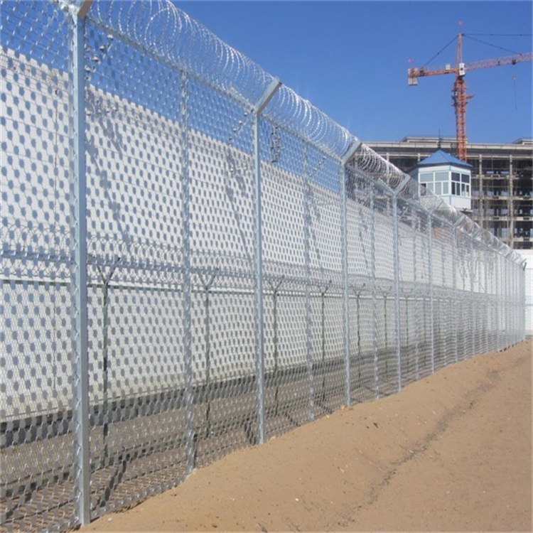 監獄刀刺隔離柵是一種防護、隔離能力極強的新型防護網產品。刀刺隔離網的網孔一般均為7.5*10cm、5*10cm、7.5*15cm、10*15cm等。鋒利的刀片焊接成網形成一道防攀爬具有嚇阻作用的安全屏障。