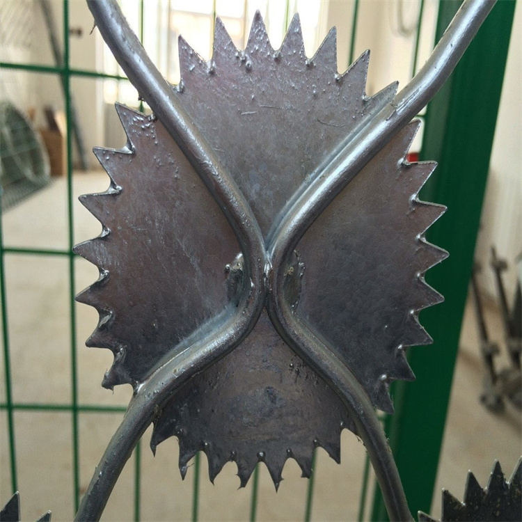 今天和大家說的是梅花刺片隔離網的太陽刺花直徑規格。這里說的太陽刺花其實就是隔離網上面那一朵朵'小花朵’, 一般監獄防爬太陽花鋼網墻高度3--5米,立柱跨度為2.5--3米。是由防盜美格網加焊防爬刺片而成,美格網的網孔一般為:100X100mm,絲徑為:5-8mm,刺片直徑50-150mm,形狀似太陽,四周布滿刺尖。焊接在美格網每一個交接點處,是由二氧化碳保護焊進行焊接的,網邊框為20X30mm40X60mm、鍍鋅方管,壁厚不得少于1.5mm,然后把焊接打磨好的邊框與網片連接,再經過靜電噴涂就算成品了。每個網孔里面的留孔尺寸為3公分,即滿足通透金屬隔離網的要求,又實現防攀爬的目的。