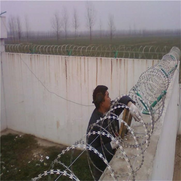 圍墻刀片刺繩是由熱鍍鋅板或不銹鋼薄板沖壓出尖銳的刀片狀,高張力鍍鋅鋼絲或者不銹鋼絲做芯線組合而成的防護產品,利用不銹鋼卡扣將刀片刺繩繞圈后相臨兩圈每隔120°用刺絲連接卡固定,張開后形成蛇腹網狀,閉合后刀片刺繩 圈徑為50cm,張開后每交叉圈安裝間距20cm,直徑不小于45cm。由于刺網造形獨特不易觸摸、形成立體圍護因而能達到極好的防護隔離效果,該產品具有嚇阻效果好、美觀、施工便利、線型可隨地勢變換、經濟實用等優異特點。