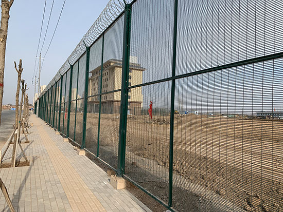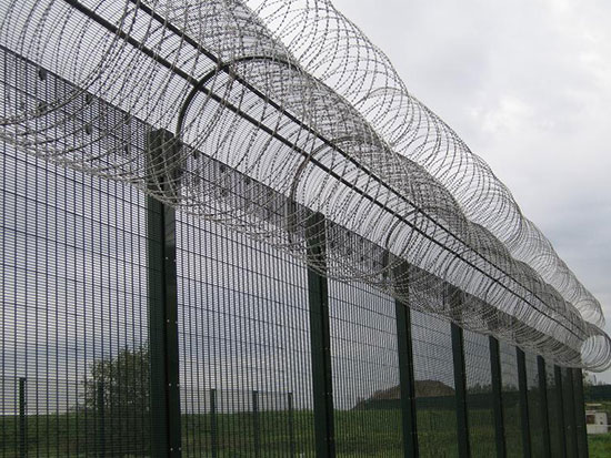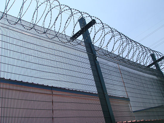 高安全隔離網(wǎng)主要是采用高強度的刀片刺網(wǎng)與普通防護(hù)網(wǎng)的結(jié)合,由V型支架立拄,加強型焊接片網(wǎng),安全防盜連接件和刀片刺網(wǎng)組成.刀片刺網(wǎng)是一種新型防護(hù)網(wǎng),由銳利尖角鍍鋅鋼板或不銹鋼薄板做刀片,鋼絲做芯線組合而成的防護(hù)器材.