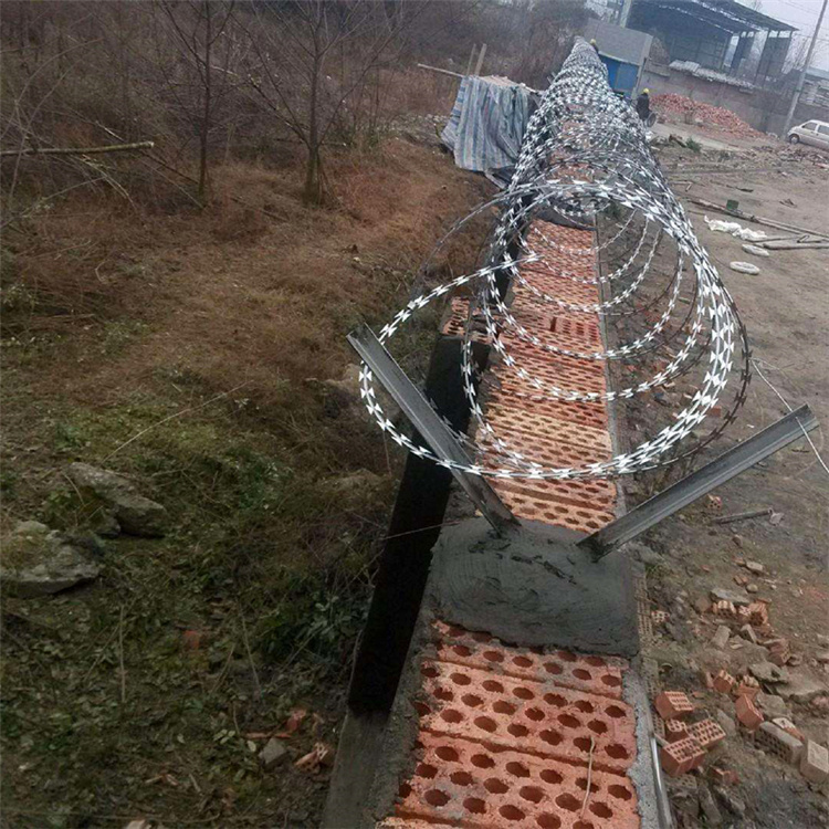 刀片刺網,是一種防護、隔離能力較強的防護產品,采用優質鋼片沖壓尖刺包裹高強度 鋼絲壓制而成,雙線用卡扣銜接固定,呈現螺旋型,既美觀又讓人不寒而栗,起到了很好的 阻嚇作用。已被廣泛用于軍事重地、監獄、政府機關、銀行、生活小區圍墻、私人住宅、別 墅圍墻、鐵路柵欄加高以及邊境線等的安全防護??梢栽趪鷫ι蠁为毷褂茫部梢源钆涓綦x 網在頂部架設。