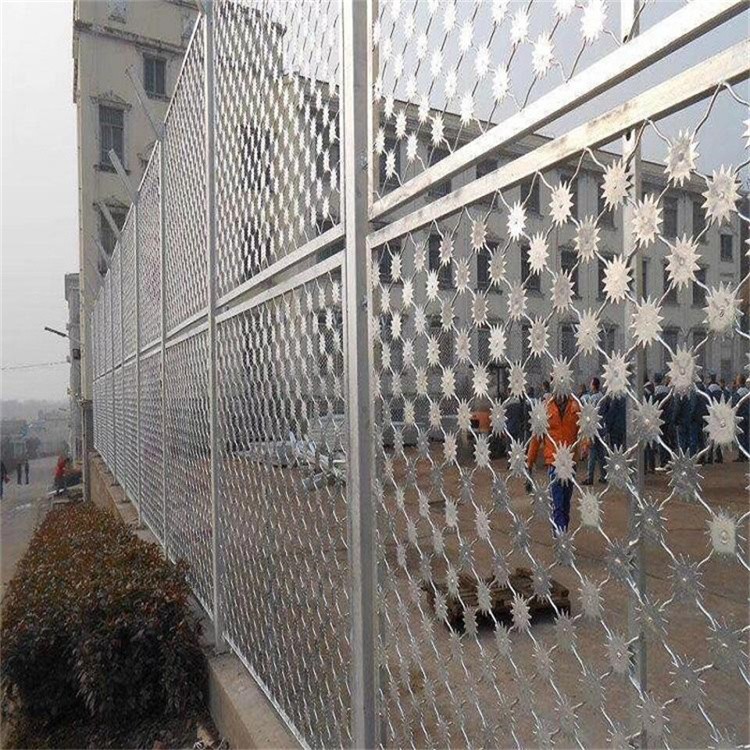 5、刀片滾網(wǎng)、拉絲、卡扣,均采用不銹鋼材質(zhì)。刀刺網(wǎng)安裝固定卡扣整體調(diào)正,使刀刺網(wǎng)不出現(xiàn)擰轉(zhuǎn)情況,刀刺刺圈分布均勻,每隔30-40cm與拉絲固定;分段連接處需將兩端刀刺網(wǎng)做連接固定,刀刺網(wǎng)固定點(diǎn)需緊鎖不得出現(xiàn)松動(dòng)、脫落現(xiàn)象;刀刺網(wǎng)安裝與隔離網(wǎng)平行,上下左右均成直線延伸,轉(zhuǎn)角處需做加密加固處理。