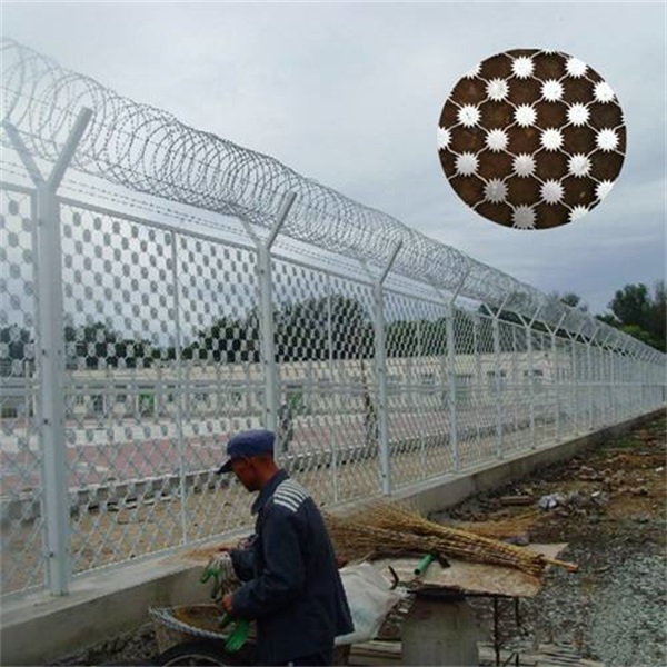 梅花刺片隔離網也刀刺網片,刀刺網片直徑規格一般是7.2公分和7.5公分,特殊的可以出8公分的。選擇這個網孔尺寸的原因是因為網孔的比例,梅花刺片隔離網的網孔常用都是10公分,刺片是焊接在網孔和網孔的連接處,這樣就把刀刺網片一分為二,每邊留3.75公分,一次焊接后,相當于10公分這個直線要去掉兩個3.75公分,還剩下3公分留空。一整片梅花刺片隔離網焊接成型以后,每個網孔里面的留孔尺寸為3公分,即滿足通透金屬隔離網的要求,又實現防攀爬的目的。