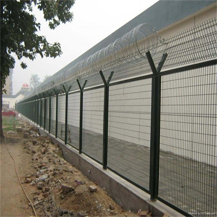 監獄隔離網V型支架加裝防拆卸刀刺網。刀刺網的直徑普通為,材質均為優質304不銹鋼,鎳含量8個以上。刺網芯線直徑為2.5mm、刀片長22mm,刀片寬度15mm,刀片厚度0.5mm. 蛇腹形刀刺網的排列密度不小于16圈/米,相鄰每圈間距不大于120mm,監獄用的刀刺網通??壑g的間隔是120mm,直徑500mm的刀刺網。