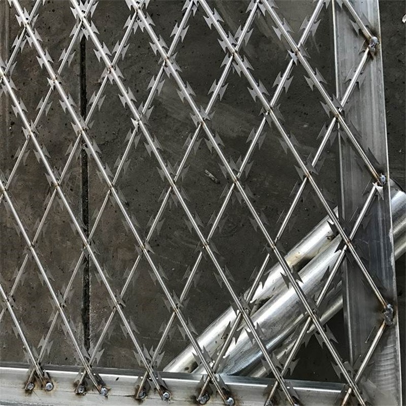 刀刺隔離網網片:外形尺寸:寬約2500mm*高約2250mm;分上下兩層結構,總高約4.5米;上下層之間邊耳連接,確保網片不變形刀片線芯:2.5mm刀片:鍍鋅鋼板、不銹鋼板工藝:熱鍍鋅-沖壓刀片型號:BTO-22網孔:50mm*100mm,75mm*150mm,200mm*200mm
