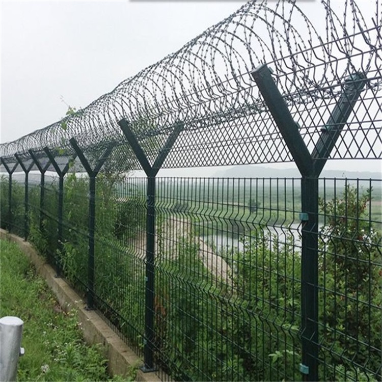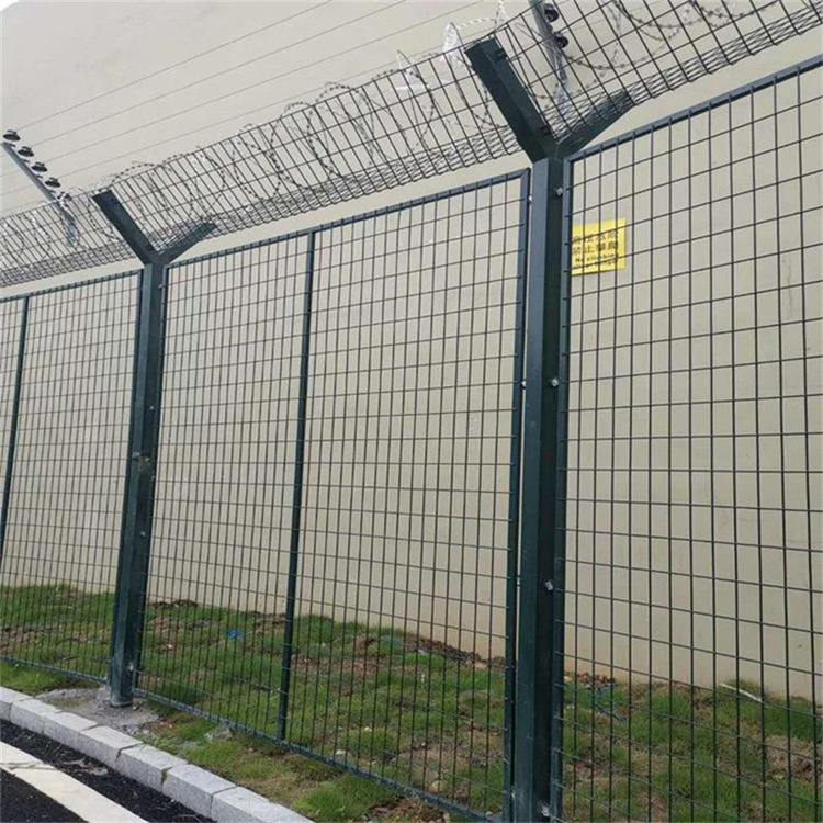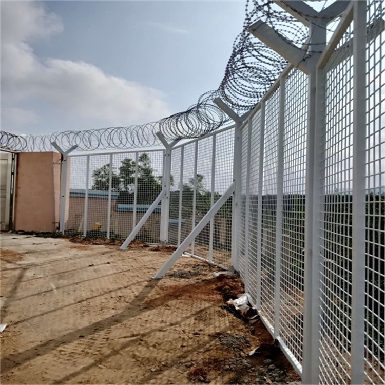 監獄焊接鋼絲防護網 規格要求: 1、網孔與絲徑:其由4-5mm直徑的鋼絲焊接而成,孔距有5cm*5cm、5cm*10cm、...頂端行成一個V字型,一般有鋼筋焊接V型網和拉線構成V型。架設的時候采用特定的卡扣、按照規定的間距進行安裝就行。 [ 查看詳情 ]