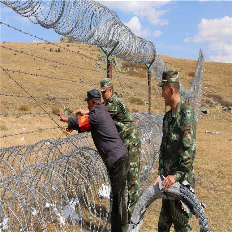 邊境圍界隔離防護 網選哪種更好 蛇腹型刀片刺網刀片刺網135 8268 7700,刮刀型刺網,刀片刺繩包括:熱鍍鋅刺鐵絲、裹塑刺鐵...噴塑塑刀刺鐵絲. 刀刺鐵絲連接方式:與鋼立柱連接 刀刺鐵絲 優點:便于運輸、防護性強、與立柱安裝不受地形起伏的限制、造價低。 [ 查看詳情 ]