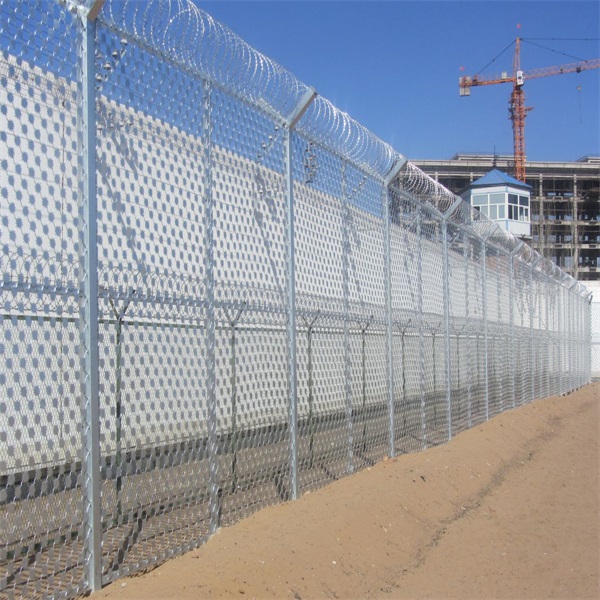 監獄圍墻外側隔離網立柱上方焊接V型支架,其上安裝中800mm的蛇腹形不銹鋼刀剌網,其中內側金屬隔離網墻在靠近監獄一側頂端加掛一道p800mm蛇腹形不銹鋼刀刺網,從加掛蛇腹形刀剌網底部的網片向下1.5米處,每個橫向絲筋加裝直線形不銹鋼刀刺以增加攀爬難度,延緩翻越時間,在內側金屬隔離網墻上安裝光纖報警系統以達到提前報警預警的作用。網墻下方設防挖擋板其深度不低于500mm。
