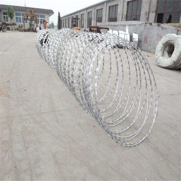 刀片刺繩規(guī)格型號為BTO-22,刀片厚度0.5±0.05,刀長22±1,刀寬15±1(單位:mm),直徑為80cm,材質(zhì)為熱鍍鋅,上鋅量30g左右,刺繩拉開后間距在20cm左右。