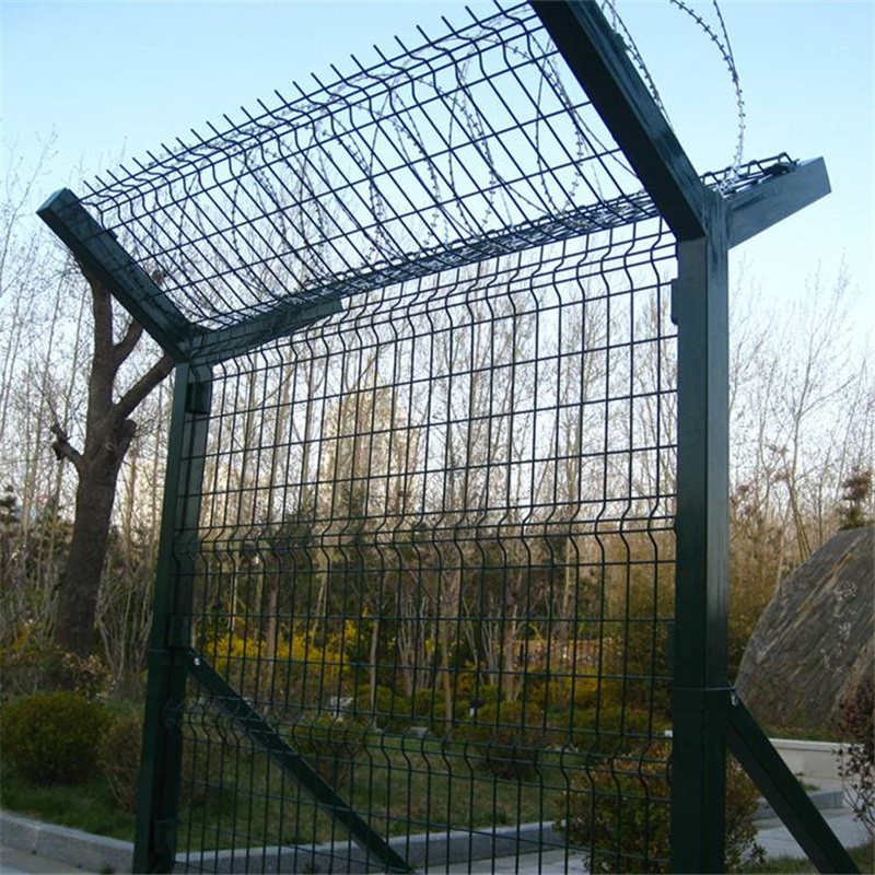 機場焊接防護隔離圍界:絲徑:4mm-6mm, 網孔:50*100mm 高度:1.8-3m  寬度:2-3m 頂部加防爬刺滾網,另外一種焊接的防護隔離圍界是用刀片刺網直條焊接而成的,網孔一般為:75*150mm ,高度和寬度(同上),這種用刀片直條焊接的機場防護圍界,具有更好的防攀爬防隔離效果。