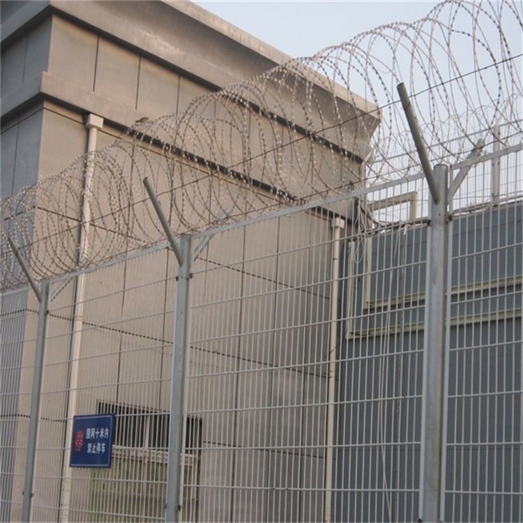 監獄刀刺片防護網又稱監獄護欄網或監獄隔離柵,主要是采用高強度的刀片刺網與普通防護網的結合,由V型支架立拄,加強型焊接片網,安全防盜連接件和刀片刺網組成.刀片刺網是一種新型防護網,由銳利尖角鍍鋅鋼板或不銹鋼薄板做刀片,鋼絲做芯線組合而成的防護器材。