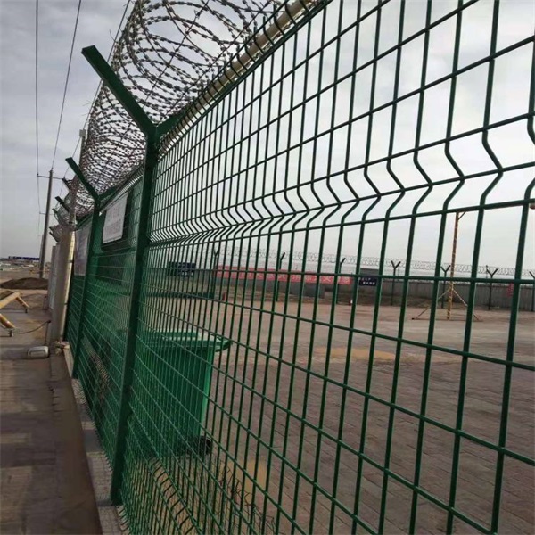 機場焊接鋼絲網圍界規格參考:絲徑:4mm-6mm, 網孔:50*100mm 高度:1.8-3m  寬度:2-3m 頂部加防爬刺滾網,另外一種焊接的防護隔離圍界是用刀片刺網直條焊接而成的,網孔一般為:75*150mm ,高度和寬度(同上),這種用刀片直條焊接的機場防護圍界,具有更好的防攀爬防隔離效果。
