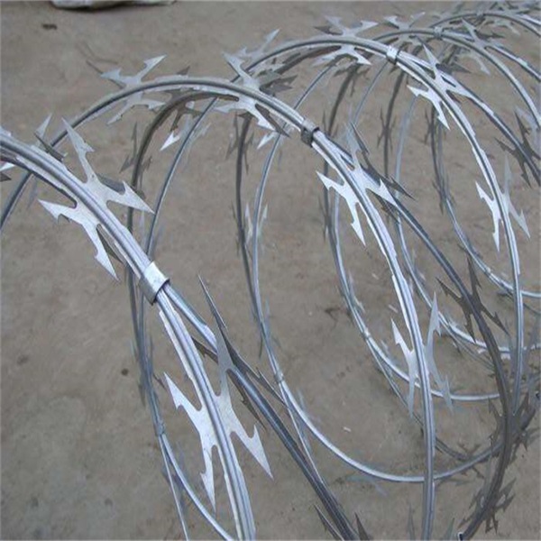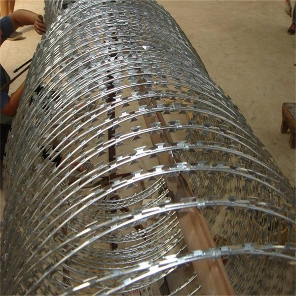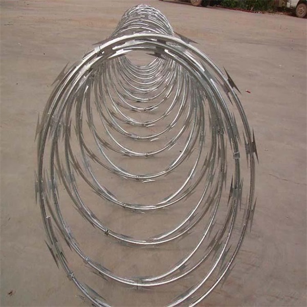 蛇腹型刀刺網,由于各區域文化名稱差異也被叫做滾刀網,蛇腹式刀刺網材料有中碳鋼絲、冷軋鍍鋅薄板,不銹鋼板,不銹鋼絲。蛇腹型刀片刺網,上、下懸掛0.5米的交叉蛇腹型刀片刺網,刀片刺網采用鋼板沖壓成型包附于鋼絲(筋絲)之上,由銳利尖角鋅鋼板或不銹鋼薄板做刀片,高張力鋼絲做芯線組合而成的。鋒利的刀型刺由雙線扣裝后成蛇腹狀既美觀又讓人不寒而粟。起到了很好的阻嚇作用。刀片刺網硬度好,制造及特點:鋼絲為芯絲,將沖壓好的刀片包裹在芯絲上,一次制成。產品具有超強的防護能力和恐嚇能力,安裝方便,壽命長。蛇腹型刀刺網的直徑常用的是500mm、600mm、800mm,其他規格均可定做,艾瑞廠家保證產品品質。