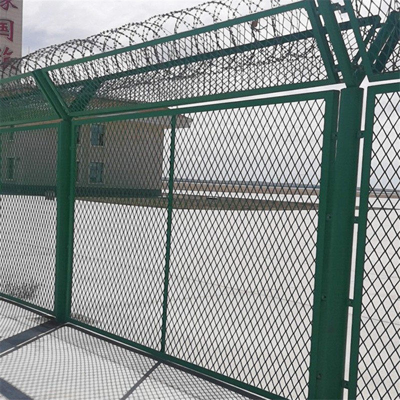 看守所鋼網墻的高度一般有1.8--2.5米,這只是網片的高度,立柱之間的跨度一般為2.5--3米,網孔為50X100mm,絲徑一般為5mm--6mm,立柱一般為60圓柱,60X60方柱,80X80方柱等,壁厚不得少于1.5mm,這些參數都是浸塑以前的厚度,立柱形狀呈Y字型,鋪設4道鍍鋅鋼絲,剛才說到,頂部增設蛇腹型刀刺網,這4道鍍鋅鐵絲就是方便安裝蛇腹型刀刺網的。刀刺網的卷徑一般為50cm--80cm,型號為BTO-22,材質分為普鋅,高鋅,不銹鋼,不銹鐵這4種。