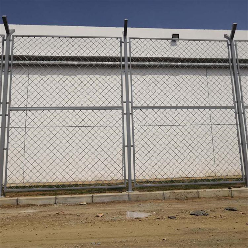 監獄隔離網主要技術參數 1.監獄隔離網的網孔:50mm×50mm。 2.監獄隔離網的網眼直徑:φ6.0mm(浸后)。 3.監獄隔離網的Y形柱間距:3.0m,頂部Y形支架做防水處理。 4.監獄隔離網的立柱管:60mm×60mm×3mm 5. 監獄隔離網的方管和框架等主要部件需要進行熱浸鍍鋅,塑料浸漬和密封等工藝處理。 6. 監獄隔離網安裝要排列均勻,致密,牢固連接。 7. 監獄隔離網的抗腐蝕能力強,表面浸塑,外觀漂亮,安全等級高. 8.監獄隔離網的框架規格40mm×20mm×2mm 9.監獄隔離網的配件有:防盜螺栓(螺母),Y形立柱,帶刺鐵絲網和隔離網,不銹鋼刺繩和內部六角形。 10.監獄隔離網的的安裝高度不少于3.4米,安裝監獄隔離網后的總高度不少于4.0米。