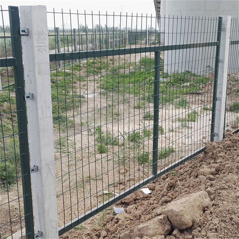 鐵路線路上采購防護柵欄是要保證安全,所以對防護柵欄要求較高。鐵路線路上使用的柵欄類型也不太一樣,根據使用的位置,鐵路防護柵欄的強度也都有區別。鐵路防護柵欄的類型大致分為:雙邊絲護欄,直框護欄,頂部30°折彎的護欄。一般鐵路線路兩側為了阻止落石或者阻擋外界的任何動物的時候會選擇雙邊絲護欄網作為隔離網。鐵路鐵軌兩側會使用直框護欄或者加折彎的護欄作為防護網。但是作為鐵路防護柵欄的護欄邊框不能使用普通的20*30mm的小邊框,而是采購30*40mm的方管邊框作為護欄網的邊框與低碳鋼絲焊接。或者是以鋼板網作為網片,四周焊接角鐵,也被稱為框架型的鐵路防護柵欄。安裝尺寸:1.8米*3米,柱中到柱中,鐵路線路上常采用水泥立柱與網片連接。邊框:30*40mm,或者40*40的角鐵。表面處理:浸塑草綠色或者浸塑墨綠色。